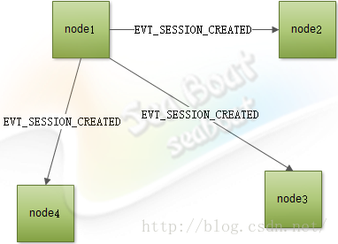 为区分不同的动作必须要先定义好各种事件,例如会话创建事件、会话访问事件、会话失效事件、获取所有会话事件、会话增量事件、会话ID改变事件等等,实际上tomcat集群会有9种事件,集群根据这些不同的事件就可以彼此进行通信,接收方对不同事件做不同的操作。如下图,例如node1节点创建完一个会话后,即向其他三个节点发送EVT_SESSION_CREATED事件,其他三个节点接收到此事件后则各自在自己本地创建一个会话,会话包含了两个很重要的属性——会话ID和创建时间,这两个属性都必须由node1节点跟着EVT_SESSION_CREATED一起发送出去,本地会话创建成功后即完成了会话创建同步工作,此时你通过会话ID查找集群中任意一个节点都可以找到对应的会话。同样对于会话访问事件,node1向其他节点发送EVT_SESSION_ACCESSED事件及会话ID,其他节点根据会话ID找到对应会话并更新会话最后访问时间,以免被认为是过期会话而被清理。类似的还有会话失效事件(同步集群销毁某会话)、会话ID改变事件(同步集群更改会话ID)等等操作。