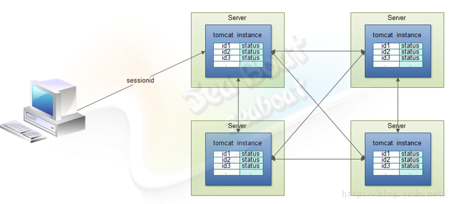 每个会话存在一个原件和一个备份,且备份与原件不会保存在同一个节点上,如下图,例如当客户端发起请求后通过负载均衡被分发到tomcat1实例节点上,生成一个包含.tomcat1后缀的会话标识,并且tomcat1节点根据一定策略选出此次会话对象备份的节点,然后将包含了{会话id,备份ip}的信息发送给tomcat2、tomcat3、tomcat4,如图中虚线所示,这样每个节点都有一个会话id、备份ip列表,即每个节点都有每个会话的备份ip地址。