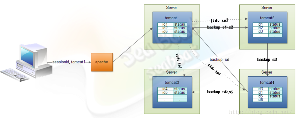 完成上面一步后就是将会话内容备份到备份节点上,假如tomcat1的s1、s2两个会话的备份地址为tomcat2,则把会话对象备份到tomcat2中,类似的有tomcat2把s3会话备份到tomcat4,tomcat4把s4、s5两个对话备份到tomcat3,这样集群中所有的会话都已经有了一份备份。当tomcat1一直不出故障,由于Session Stick技术客户端将一直访问到tomcat1节点上,保证一直能获取到会话。而当tomcat1出故障了,这时tomcat也提供了一个failover机制,apache感知到后端集群tomcat1节点被移除了,这时它会把请求随机分配到其他任意节点上,接下去会有两种情况:
