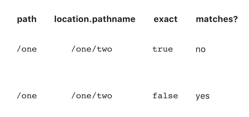 到现在,我们一直还没有实现的是 matchPath 函数。这个函数在我们的 router 中是特别关键的,因为它是判断当前 URL 是否匹配上了 <Route> 组件的关键点。matchPath 值得注意的一点是一定要把 <Route> 的 exact 考虑清楚。如果你对 exact 还不了解,看下下面这句话,给出了规范文档中的解释: