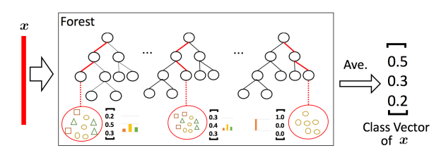 每个森林中都包括好多棵决策树,每个决策树都会决策出一个类向量结果(以3类为例,下面也是),然后综合所有的决策树结果,再取均值,生成每个森林的最终决策结果——一个3维类向量!每个森林的决策过程如下图2所示。
