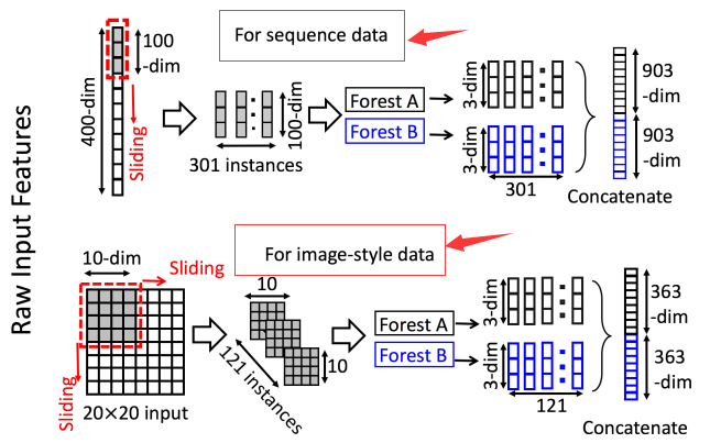 对于序列数据,假设我们的输入特征是400维,扫描窗口大小是100维,这样就得到301个100维的特征向量,每个100维的特征向量对应一个3分类的类向量,即得到:301个*3维类向量!最终每棵森林会得到903维的衍生特征变量!