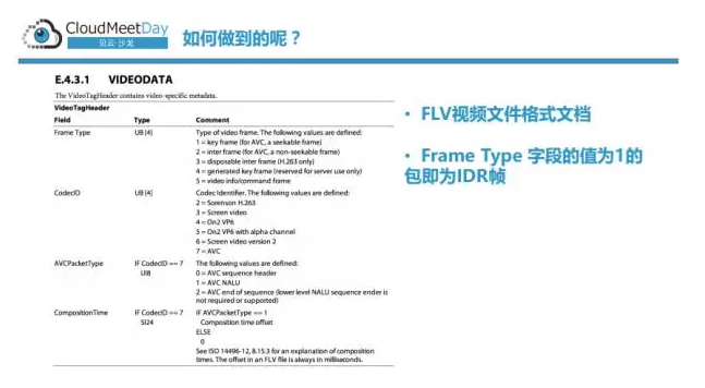 没有什么好的方法,任何人做这种事时候都是一个笨的方法,就是去看文档,没有什么捷径。大家可以翻阅FLV视频文件格式文档,它会告诉你package里头,它任何一个Video里的package有一个Video TagHeader,对它是有一个Frame Type,Frame Type如果把它解出来,它是1的时候,它管这个叫key Frame,咱们看后面这个AVC,a seekable Frame你可以理解为它是个IDR帧,它并不一定就是I帧。