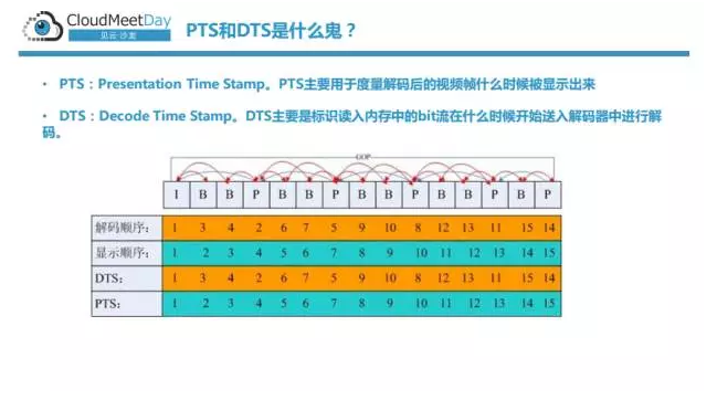 PTS,Presentation Time Stamp也就说这个帧什么时候会放在显示器上;DTS就是Decode Time Stamp,就是说这个帧什么时候被放在编码器去解。那么如果全是I帧和P帧,PTS和DTS都是单调递增的,那么如果我们有B帧,会出现什么情况?因为大家都知道,对于B帧来讲,它会引用前面的帧和后面的帧。