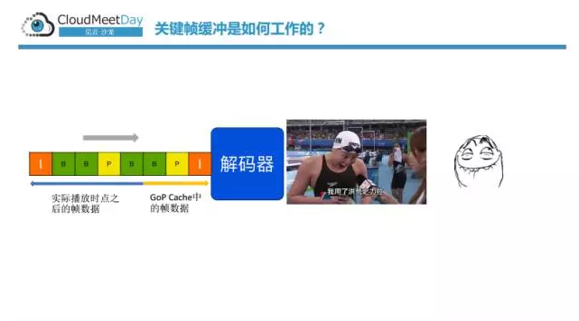 其实是在cache服务器上,它会去预先解一下这个帧,然后去看它到底是个I帧,还是个B帧,还是个P帧,当它发现是I帧的时候,它会放在它的程序的内存里头,当你每一次打开这个视频流的时候,cache服务器会把内存中的I帧发送给客户端比如当前播放到了P帧,那我把P帧前面的I帧和P帧全波放到cache的内存里,然后当客户端接入之后先把内存里的数据发送给客户端解码器,然后再从这个B帧往后给。对于这个解码器来讲,它很舒服,它接到第一个数据流的第一个包肯定是I帧,那么它就可以直接播放了。