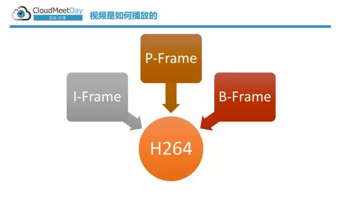 视频要播放它肯定是有视频数据,把视频数据放到编码器,然后编码器把这个视频数据解码出来,解成图片,然后播放到显示器上,这是一个基本的播放流程。一般来讲,大家现在主流的用H.264编码。对于H.264编码来说,我们会有三个不同的帧,所谓帧是什么呢?就是你看到的每一个图像。我们看到动态的视频,大家知道电影最开始用胶片拍的时候,每秒是25帧,是每秒25个图片在切换。对于H.264来讲,我们常见的有I帧,P帧,和B帧。
