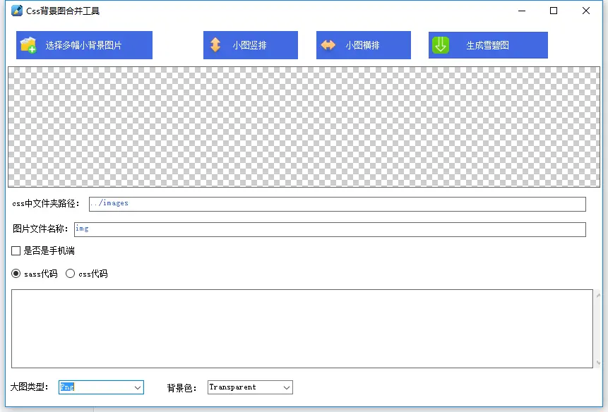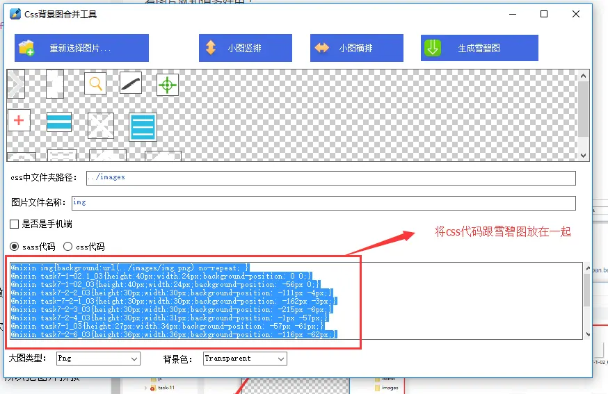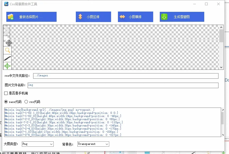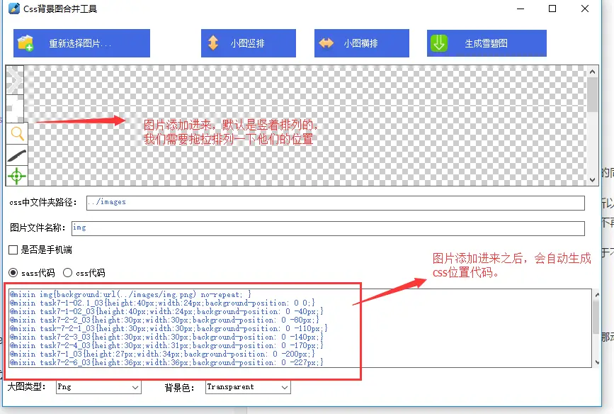 该工具可以直接通过选择图片进行图片的拼接,当然你也可以自己挪动里面的图片,自己去布局你的雪碧图,更换图片的时候也只要更改一下图片的位置就可以了。直接生成代码,简单易用