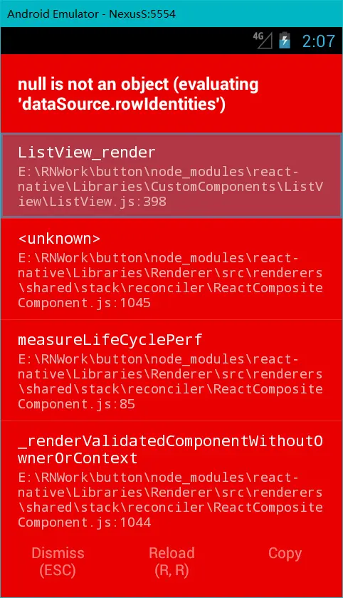 APP一启动,马上就要渲染ListView,而fetch数据是一个耗时操作,在启动APP的一瞬间this.state.data肯定是没有数据的!所以在渲染listview时提取数据,发现你传给他的dataSource居然是个空的,那他当然不干,要给你报红了!