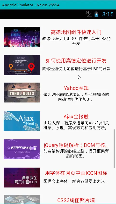 除了rowData.name、rowData.description、rowData.picSmall,我相信大家都很容易看明白这个布局的实现,至此我们所有的代码如下:(还有个坑呢,继续看完!)
