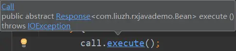 //请求3条数据,最后url就拼接成了最顶上给的url,是一毛一样的 //没错,网络请求有异常,得try/catch一下 Call<Bean> call = apiService.getCall(3); try { call.execute();//执行call,也就是正式发起网络请求咯! } catch (IOException e) { e.printStackTrace(); }那么问题来了,发起网络请求之后,我去哪儿得到数据呢!机智的我把鼠标放在"execute()"上,然后按下ctrl键: