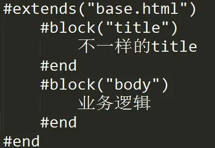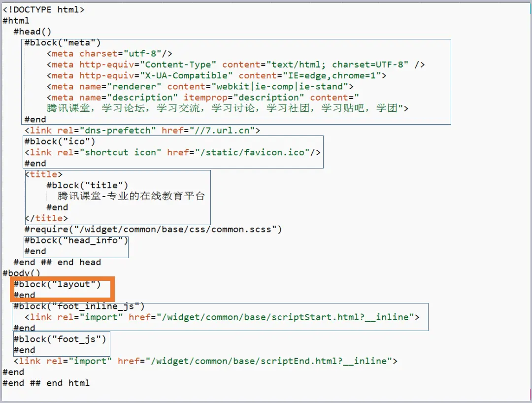,如上图,我们在通用父类中定义通用的属性(如蓝色框所示),相信在一个产品线中,所有页面一致的部分包括通用的公共样式(reset.css等)、通用的脚本库(jquery等)、ico和某些meta,对于不变的无需定义属性key,等有需要的时候再定义便可。页面有可能不变的包括meta、title、header、footer等,可提前定义属性key,见上图的蓝色框,定义好base类后,我们的页面便可简化为如下图所示: