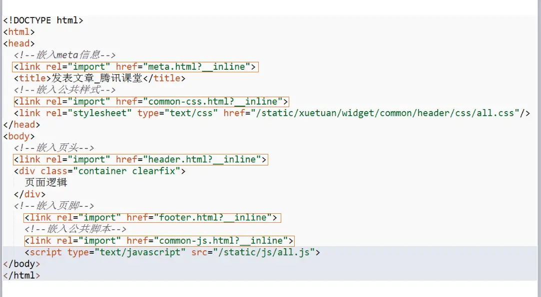 但是A同学相当靠谱,他的程序经常出bug,导致每一次修改页头和页脚都需要通知B同学,然后B同学需要把需要修改部分黏贴覆盖到代码中。这种方式很明显会带来两个问题:1、修改困难,同一个修改需要同步多次, 2、维护困难,需要维护大量相同的代码。于是B同学想到了另外一种方式,把公共部分分别抽取为单独的一个文件,然后用inline的方式引入,方式如下图所示: