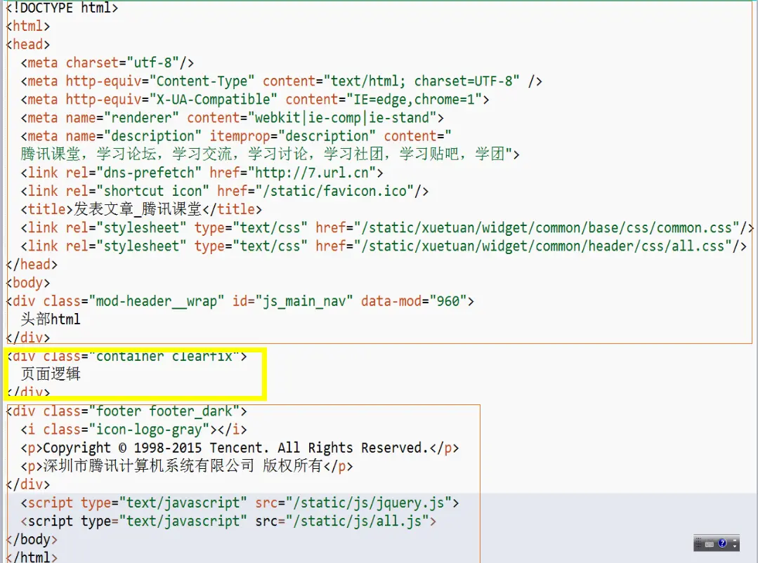 假设A同学和B同学分别开发页面A和B,这两个页面的特点是页头、页脚和公共资源都是一样的,唯一不同的就是内容部分(即是body)。B同学发现这个特点后,聪明的只开发内容部分,其它相同等A同学开发后把相同的代码拷贝过来便可。相同部分如下图红框,不同部分如下图黄框: