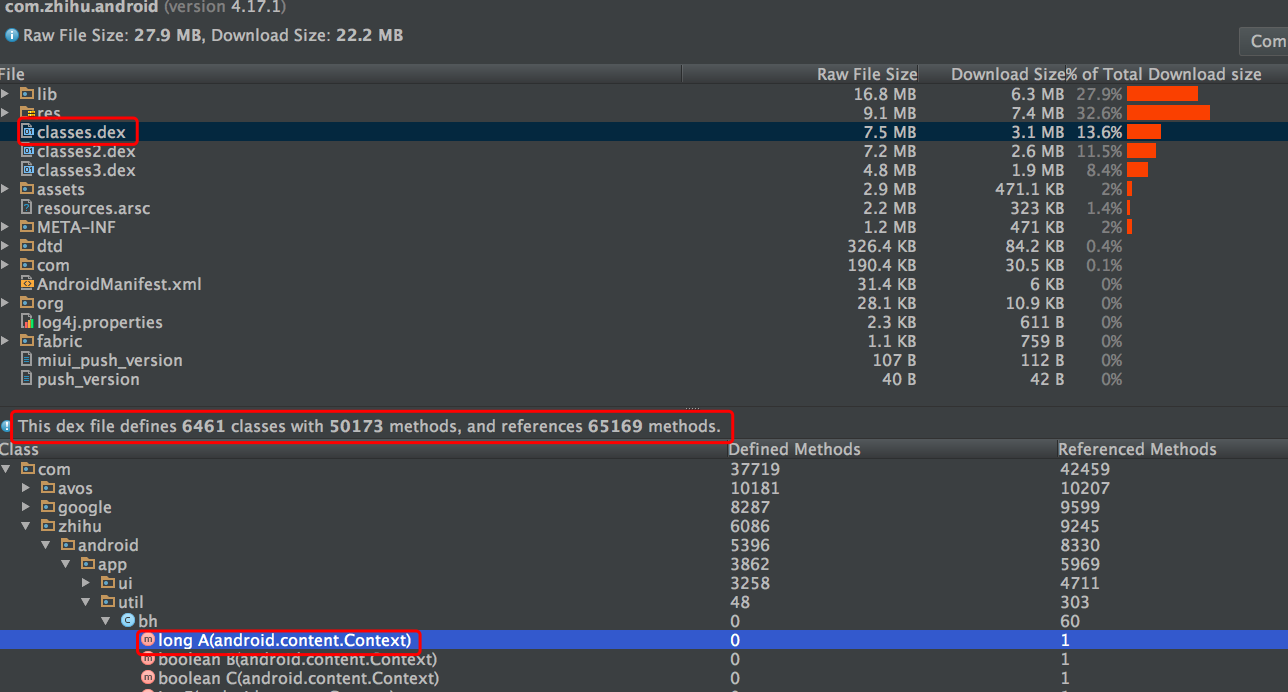 第三个红框可以看出,知乎apk使用了混淆,我们看不到真正的方法名了。