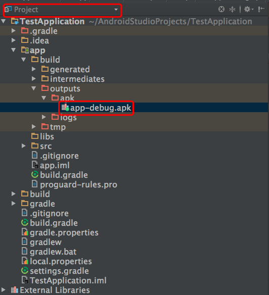 第二种,若是你项目中已经build apk,那么使用project视图。打开整体project—>app—>bulid—>outputs—>apk—>[XXX].apk,双击[XXX].apk即可。其实,只要你的apk在项目中,双击即可;