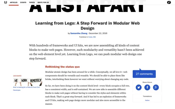 其实设计师只要在代码库里可以自由移动的话,工作方式会非常多样。如果正好我和工程师都准备好了,就可以同时投身这个项目。如果我先开始设计而工程师还在忙其他项目的话,我可以先把 HTML 和 CSS 都写了;或者有时候我非常忙,那工程师可以用内部的 Pattern library 设计素材库先搭起来一个他觉得过得去(我不一定看得过去)的东西,等我有空的时候再把我要做的改动加上去。