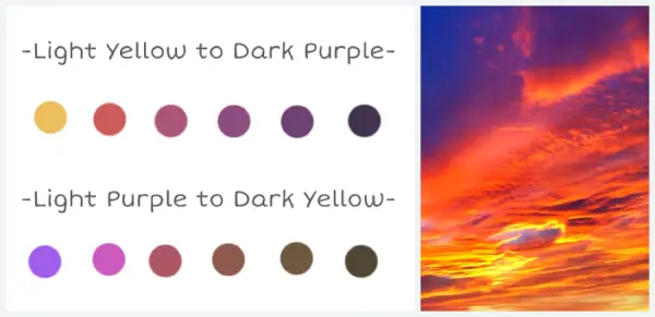 很多人还很喜欢文章中提到的一个小技巧:颜色变换不能只看数字。如果你把颜色纯粹当作一个数据变量的话,你会认为浅黄渐变到深紫和浅紫变到深黄应该是完全一致的,但是它给人的感觉是完全不一样的。人眼看到的颜色主要是大自然中的颜色,你看到的晚霞是从深紫到金黄的变化,而你在自然界中很难找到浅紫到深黄的变化,这样的搭配就会让数据看起来很没有逻辑。所以在色相和明度变化之外,就是色彩搭配要和自然界或者人们常见的颜色相符。我们常用的几种自然界的渐变色包括:浅黄到明亮的绿色再到深蓝,或者浅黄到深紫,这是晚霞的颜色,浅黄到红再到棕色,差不多是火焰的颜色。