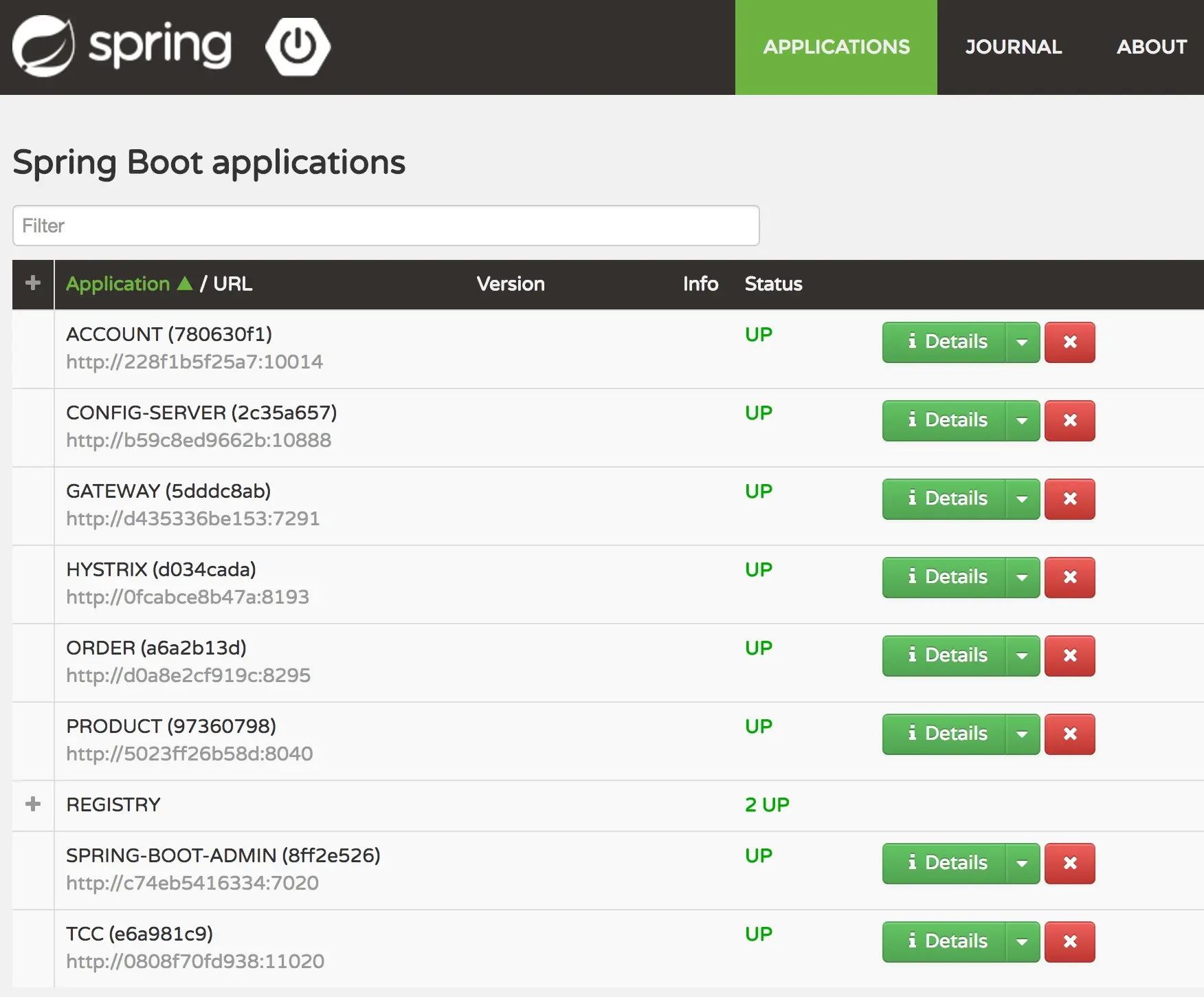 此应用提供了管理Spring Boot服务的简单UI, 下图是在容器中运行时的服务健康检测页