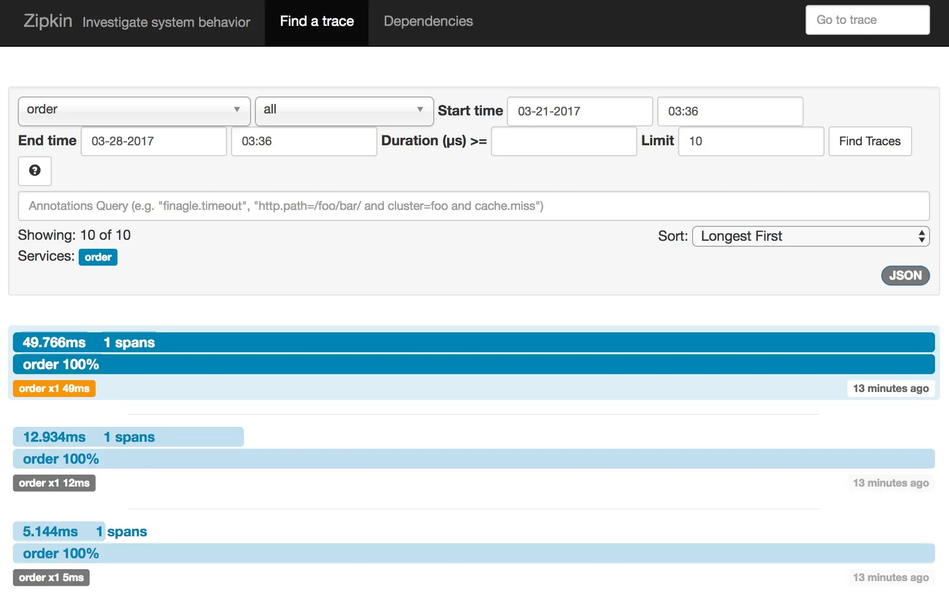 Zipkin是一款开源的分布式实时数据追踪系统, 其主要功能是聚集来自各个异构系统的实时监控数据, 用来追踪微服务架构下的系统时延问题. 下图是对order服务的请求进行追踪的情况