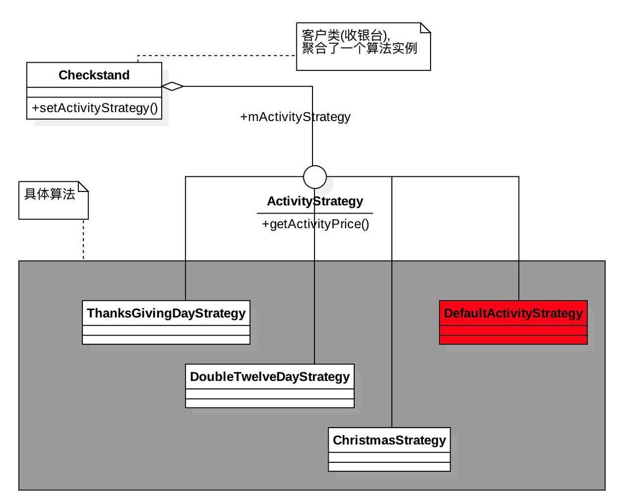 在展示本例策略模式的UML类图时, 我们将DefaultActivityStrategy类标记成红色了, 这是为什么呢?