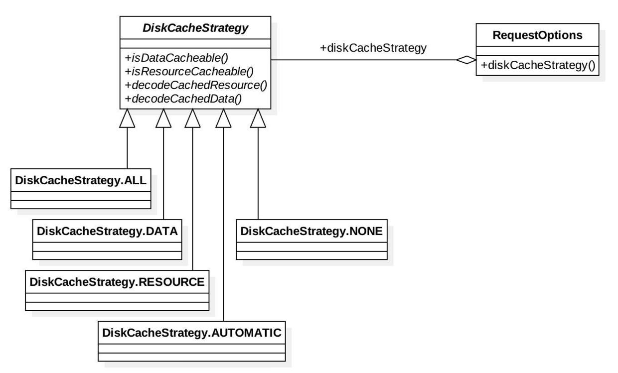 策略模式由于其优秀的对外扩展性和对内封装性, 在一些SDK或是优秀开源库中会经常用到. 还是以Glide为例, 其图片的磁盘缓存就使用了策略模式, 并提供了很多策略供用户选择: