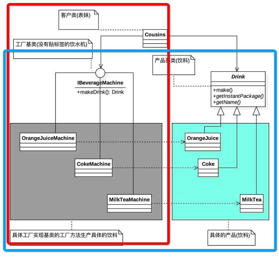 蓝色部分是工厂方法模式的使用, 作用在于生产出不同的饮品.