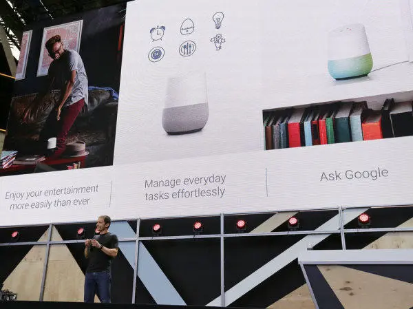 (Google副总裁Mario Queiroz在Google I/O 2016上讲解Google Home的用法,图片来源:Eric Risberg)