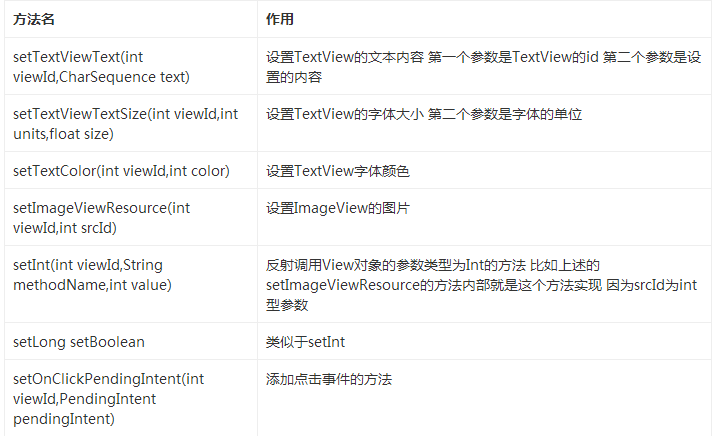 RemoteViews是一种远程View, 可以在其他进程中显示,可以跨进程更新界面;RemoteViews不能支持所有的View类型,也不能支持自定义View, 只支持如下类型: