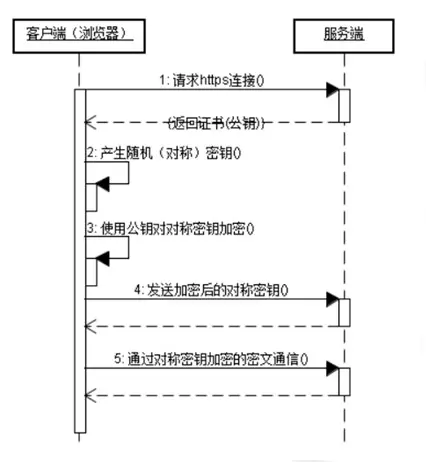客户端首先向一个权威的服务器检查证书的合法性,如果证书合法,客户端产生一段随机数,这个随机数就作为通信的密钥,我们称之为对称密钥,用公钥加密这段随机数,然后发送到服务器