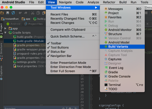 每次调试的都更新下minSdkVersion,这样一是使用不方便,另外是容易出错,容易把错误的代码提交到版本库,导致不必要的错误出现,有没有一种方式能够通过配置构建不同的环境,开发的时候使用Instant Run,Release的时候再支持Android 5.0以下的版本呢?这就要利用强大的gradle了。
