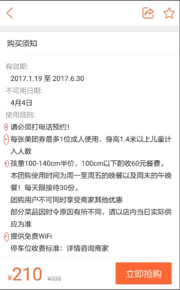android:text="孩童100-140CM半价,100CM以下收60元餐费。本团购使用时间为周一到周五的晚餐以及周末的午餐!每天限接待30份\n团购用户不可同时享受其他优惠"