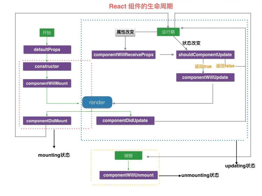 在 React 中为每个状态又分别提供了两种处理函数,就是 will 和 did , will 是进入状态之前调用的, did 是进入状态之后调用的.