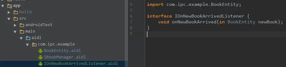 要注意的是,自定义的Parcelable对象和AIDL对象必须要显示import进来,不管他们是否和当前的AIDL文件位于同一包内。比如IBookManager.aidl这个文件里面用到了BookEntity这个类,BookEntity这个类实现了Parcelable接口,虽然他们位于同一包中但必须遵循AIDL规范,仍然要显式的import进来。另外,上一篇文中也提到过,如果AIDL文件中用到了自定义的Parcelable对象,那么必须新建一个和它同名的AIDL文件,并在其中声明它为Parcelable类型。