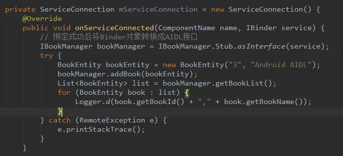 接下来在之前示例上继续完善,在客户端给服务端添加一本书然后再获取一次看看程序是否正常工作。客户端在服务连接后,在onServiceConnected中调用addBook(),再次查询会发现添加成功了。