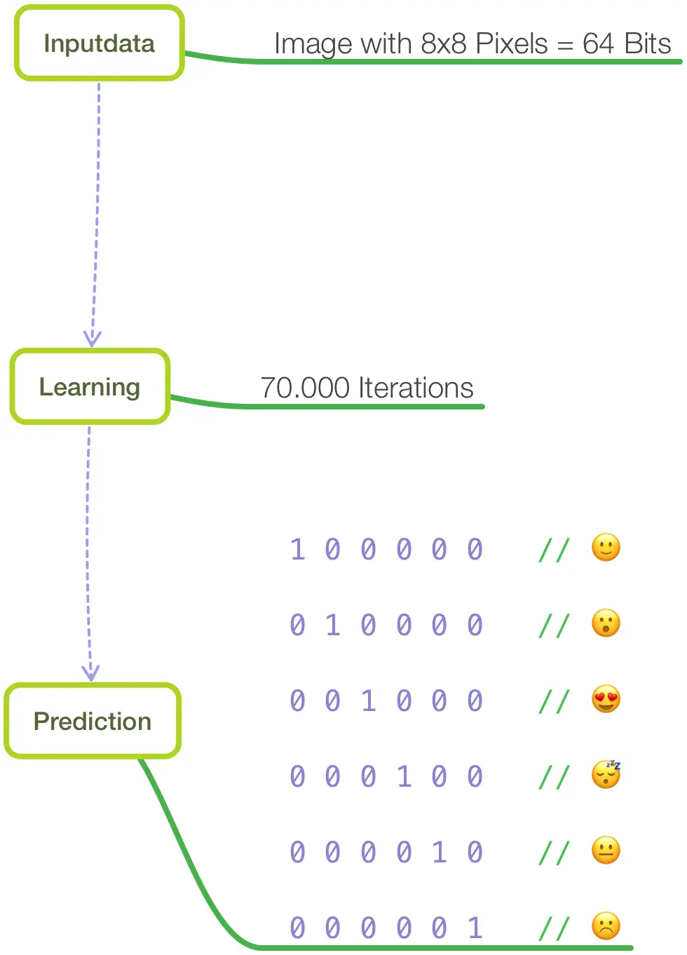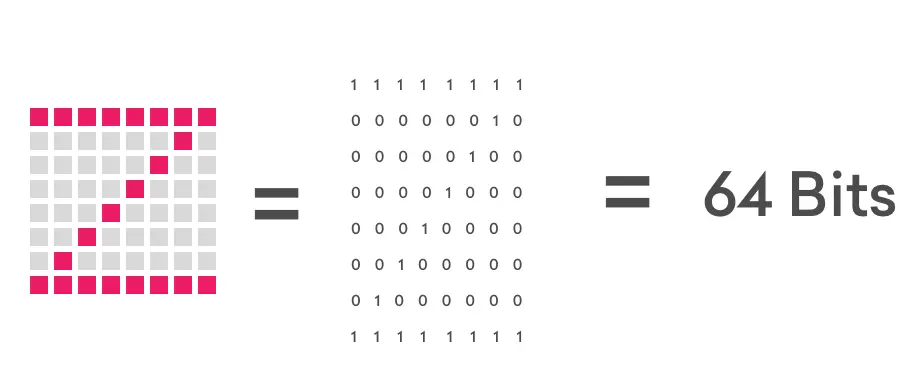 I have already mentioned that the input to this network are 64 binary numbers. I resize the drawn image to 8x8 pixels which makes together 64 pixels. I go through the image and check each pixel if the pixel has a pink color I add a 1 to my array else I add a 0. At the end I will have 64 binary numbers which I can add to my input layer.