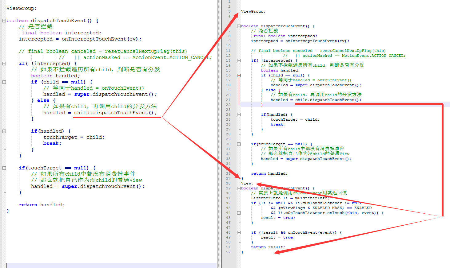 来,follow me进入源码查看,所有的核心在于ViewGroup的dispatchTouchEvent方法: