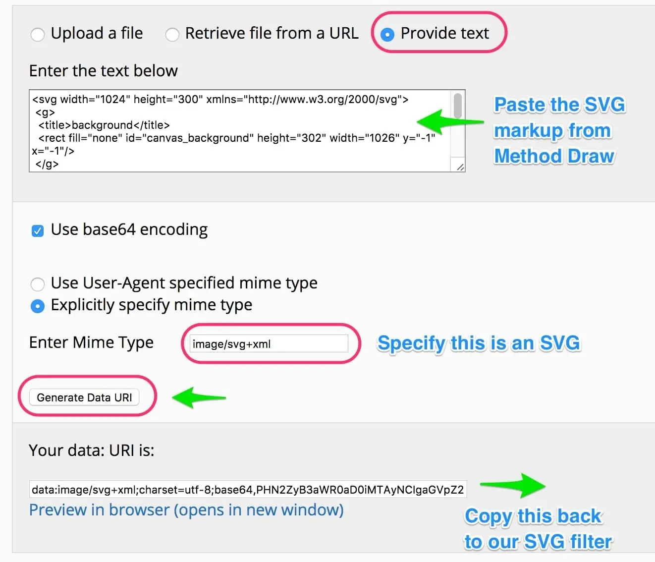 为了把这个形状应用到滤镜中去,需要把这个形状转换成base64编码,打开这个在线工具,点击Provide text选项,把SVG源代码贴进去,如下图所示: