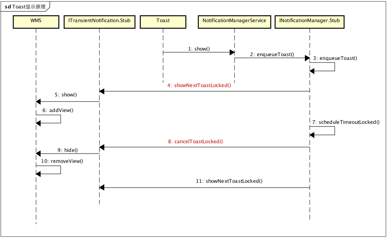 } 之后再将Toast的显示请求发送给该服务,在发送的过程中传递一个Binder实体,提供给NotificationManagerService回调使用,不过如果看下NotificationManagerService就会发现,该类并不是Binder实体,所以本身不是服务逻辑的承载体,在NotificationManagerService中,真正的服务对象是INotificationManager.Stub,因此到Service端,真正请求的服务是INotificationManager.Stub的enqueueToast: