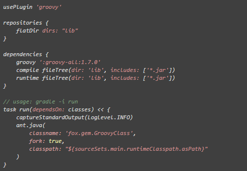 以上是Gradle的构建文件build.gradle中的内容,是不是比Ant的build.xml要简单太多了?这就是“惯例”的力量。由此,我们可以了解Gradle的第一个特点:“CoC(惯例优于配置)”。只要按照Gradle的惯例,那么可以最大限度的减少build文件的内容。