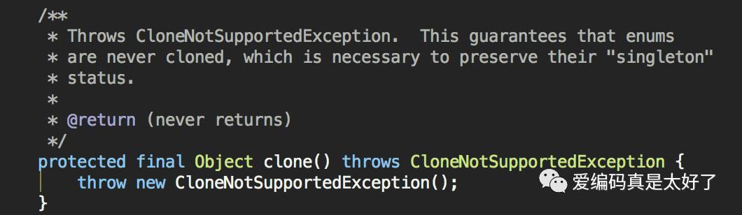 所有枚举类的公共抽象父类都是Enum类,在Enum类中重写了clone方法,并使用final定义不能被子类重写。