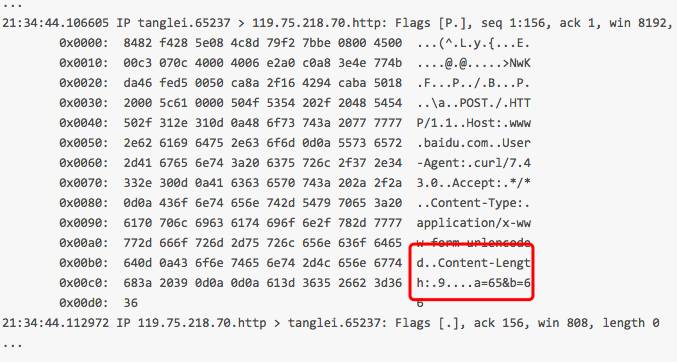 用 curl 执行, curl -i -H "Content-Type: application/x-www-form-urlencoded" -d "a=65&b=66" "http://www.baidu.com".