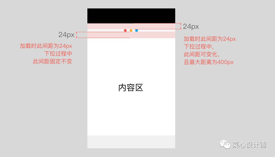总的来说,我们需要标明动画加载时,动画与导航栏的间距,与内容区的间距,且下拉过程中哪个间距是可变的、哪个间距是不可变的等等,甚至还需要考虑可拉动的最大距离是多少,当然拉动时的弹性是系统自带的,一般不予考虑。