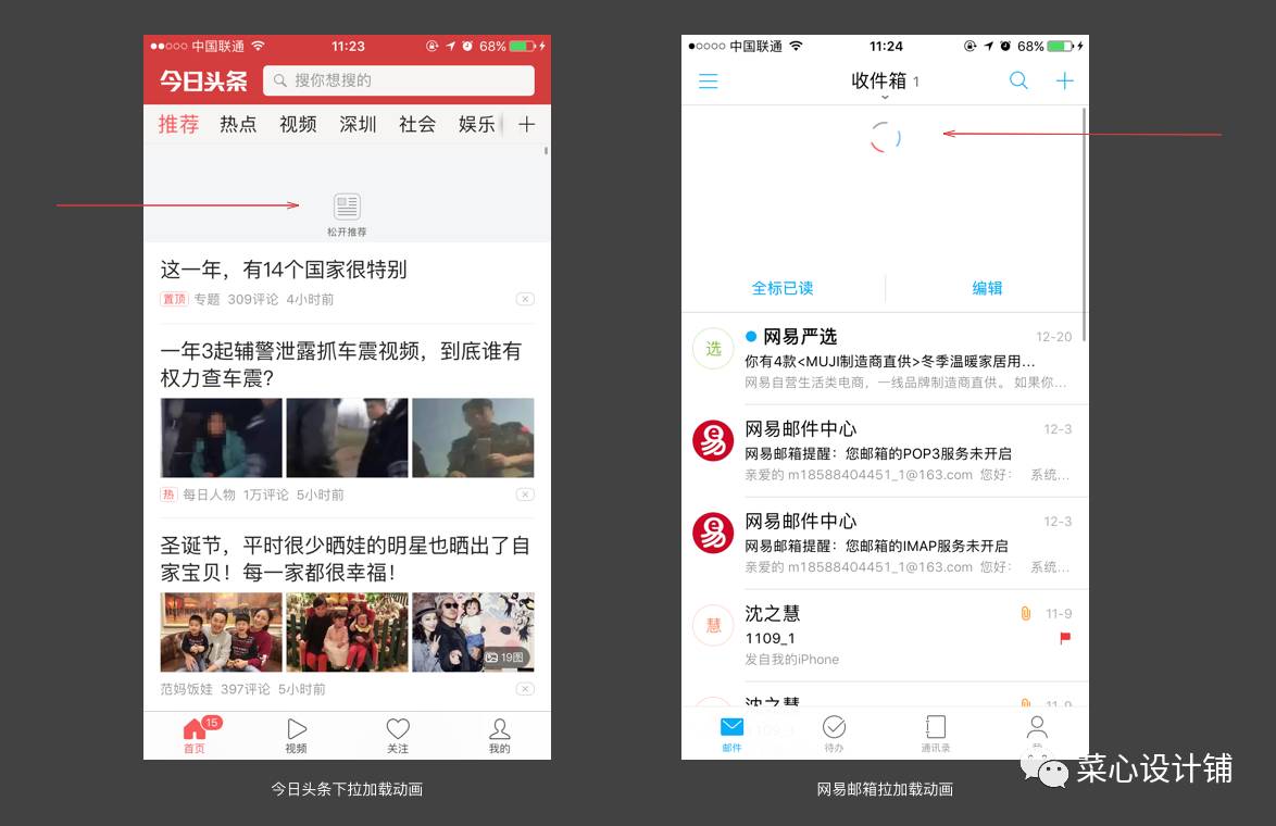 下拉加载一般分为两种形式:动画加文字(如今日头条下拉加载样式)、纯动画(如网易邮箱)。