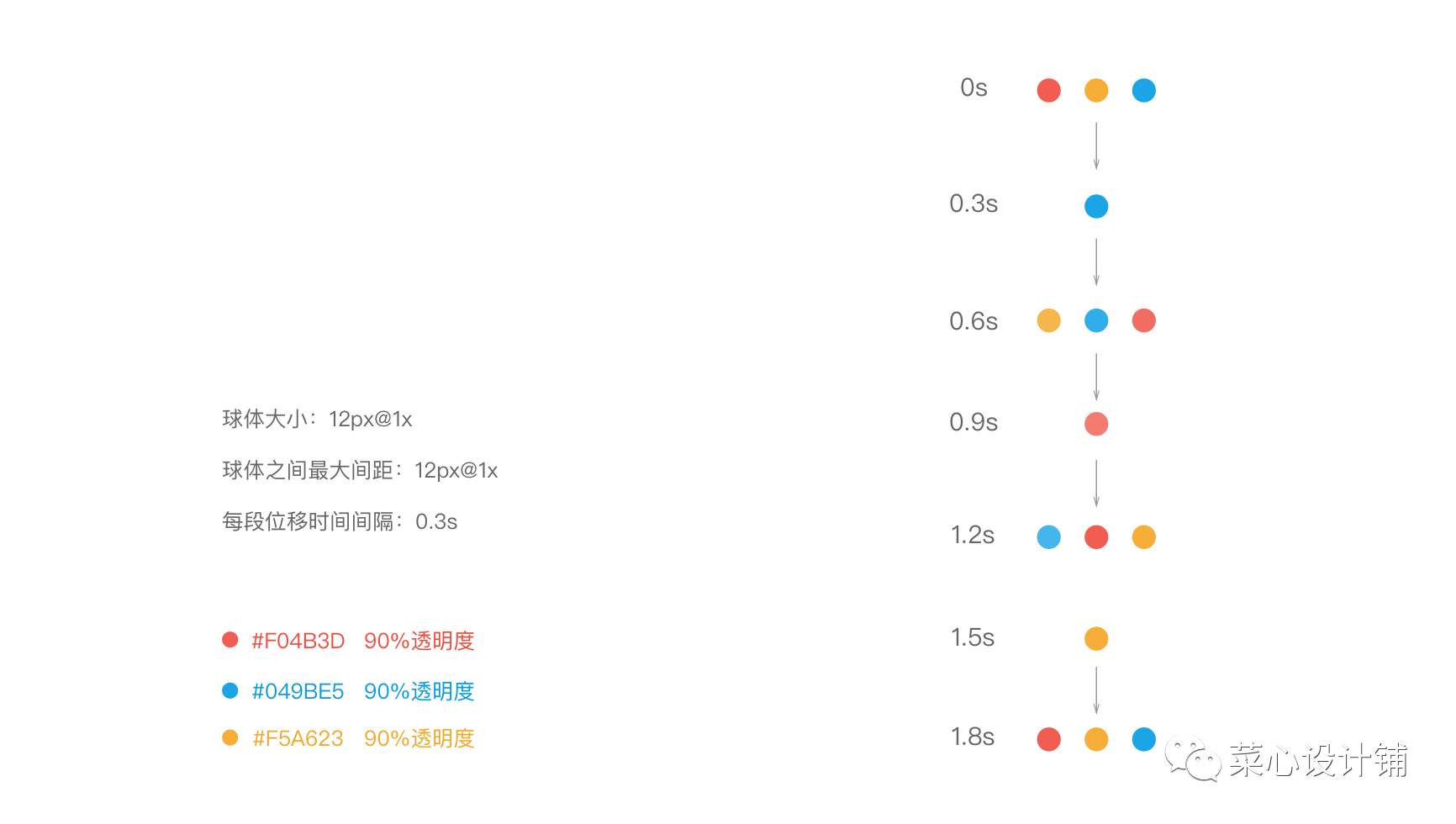 首先你需要将动画本身的规则写出来,如我们目前制作的这三个小球,一个循环内平均有6个关键节点,每个节点需要0.3秒,也就是循环一次需要1.8秒,我们将其动作全部分解输出给开发,并将圆球的大小、颜色等信息注明,这样开发看到规则后就会一目了然,保证动画的还原度。