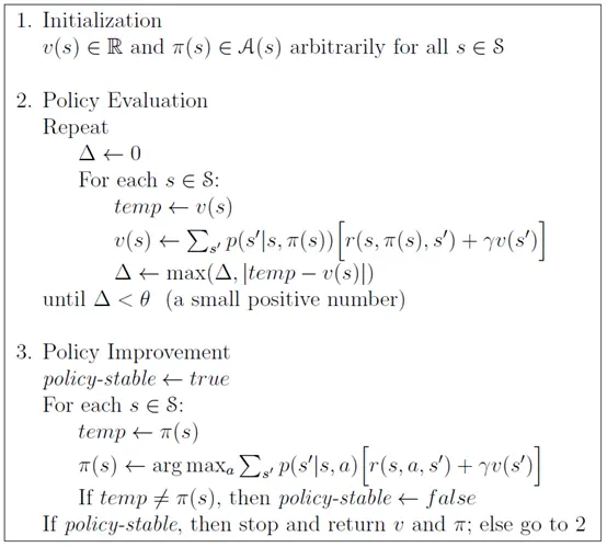 策略迭代分为两个步骤:策略评估和策略改进,即首先评估策略,得到状态值函数,其次,改进策略,如果新的策略比之前好,就替代老的策略。