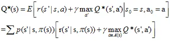 其中,π代表上述提到的策略,Q π (s, a)相比于V π (s),引入了动作,被称作动作值函数。对贝尔曼方程求最优解,就得到了贝尔曼最优性方程。