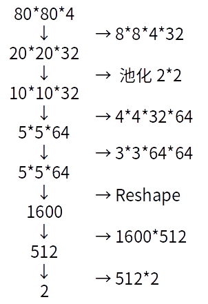 - 初始输入四幅图像80×80×4(4代表输入通道,初始时四幅图像是完全一致的),经过卷积核8×8×4×32(输入通道4,输出通道32),步距为4(每步卷积走4个像素点),得到32幅特征图(feature map),大小为20×20;