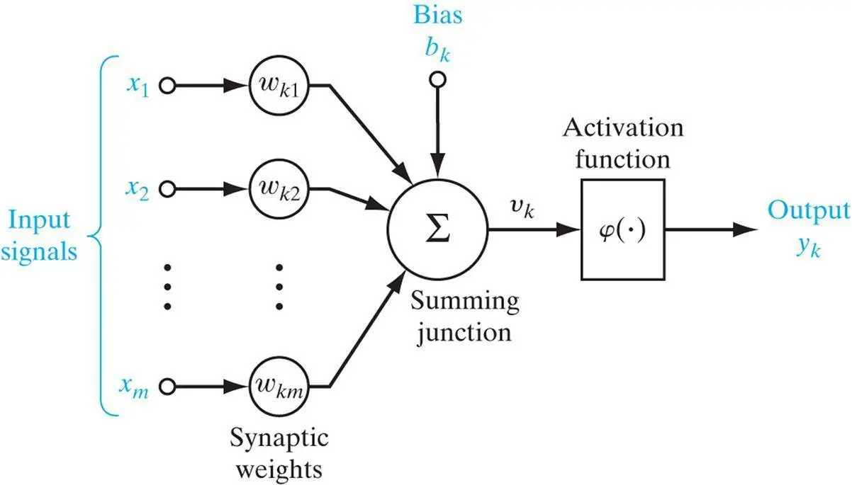 人工神经元的输入(x1,x2...xm)类似于生物神经元的树突,输入经过不同的权值(wk1, wk2, ....wkn),加上偏置,经过激活函数得到输出,最后将输出传输到下一层神经元进行处理。