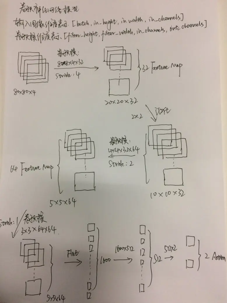终于到了展示模型的时候,下面这幅图是笔者手画的(用电脑画太费时,将就看吧),这幅图展示了本文中用于训练游戏所用的卷积神经网络模型。