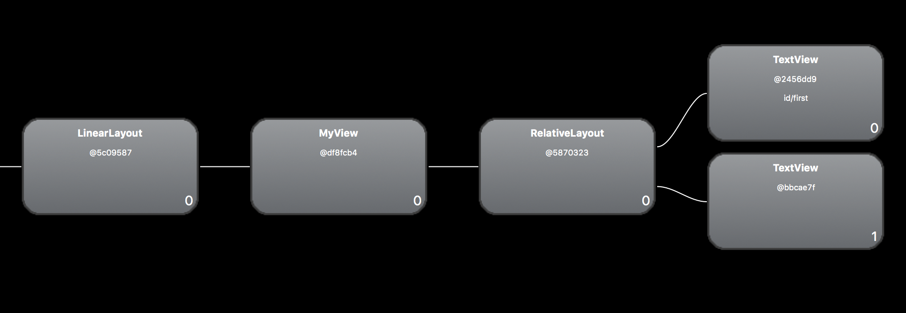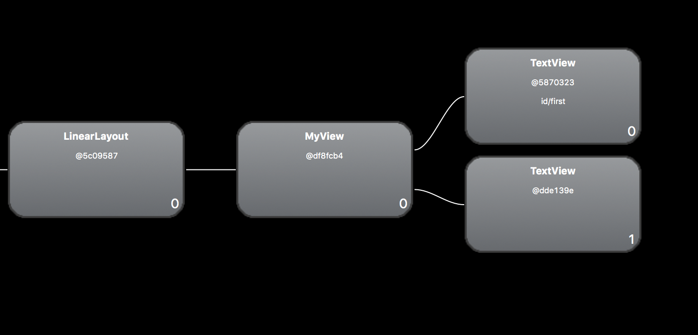 没错,多了一层,也就是MyView明明可以很好的承载两个TextView,为什么还要多一个ViewGroup承载呢?我们作为一名开发者,不能容忍任何性能的消耗,所以这种情况,我们可能需要使用merge标签